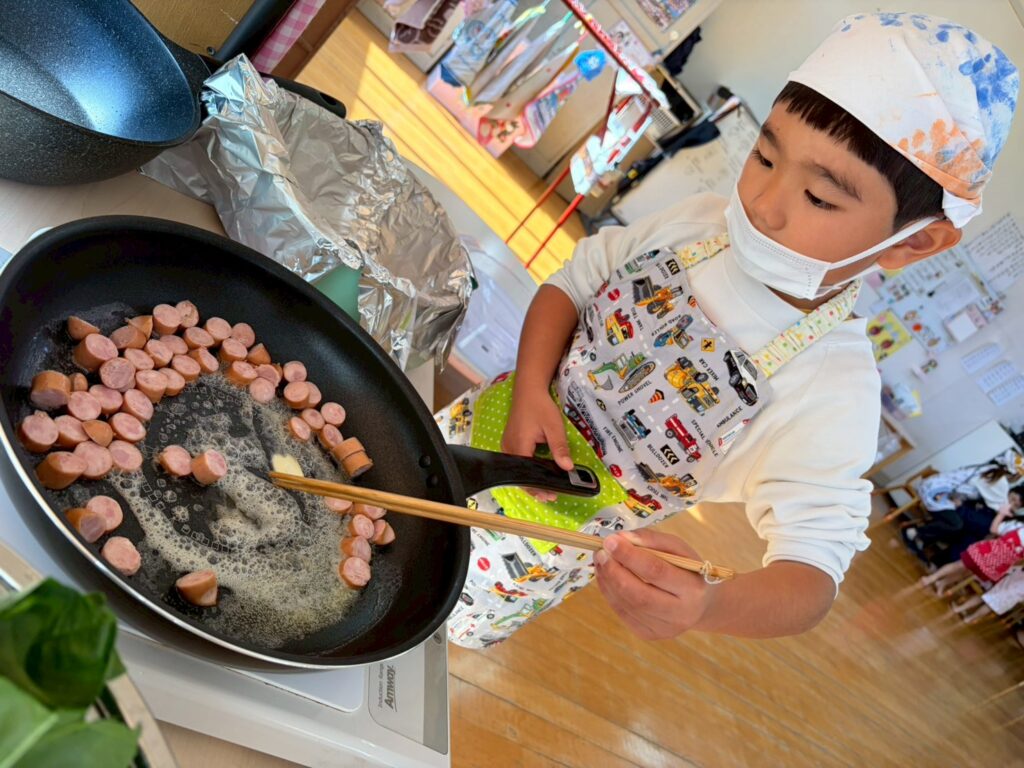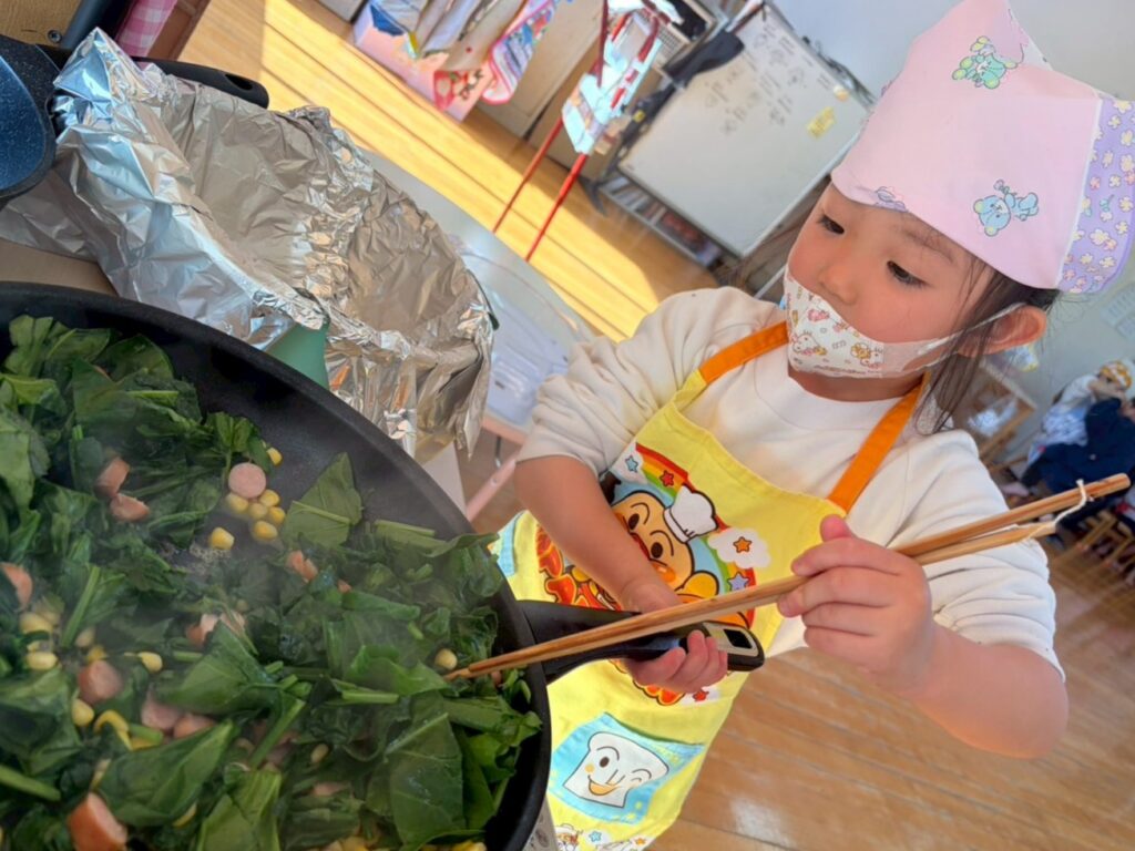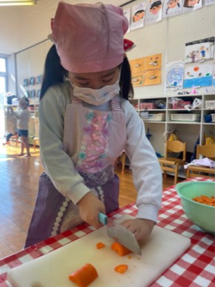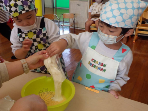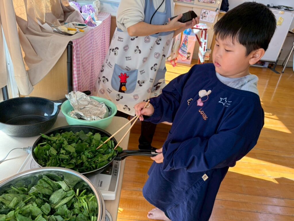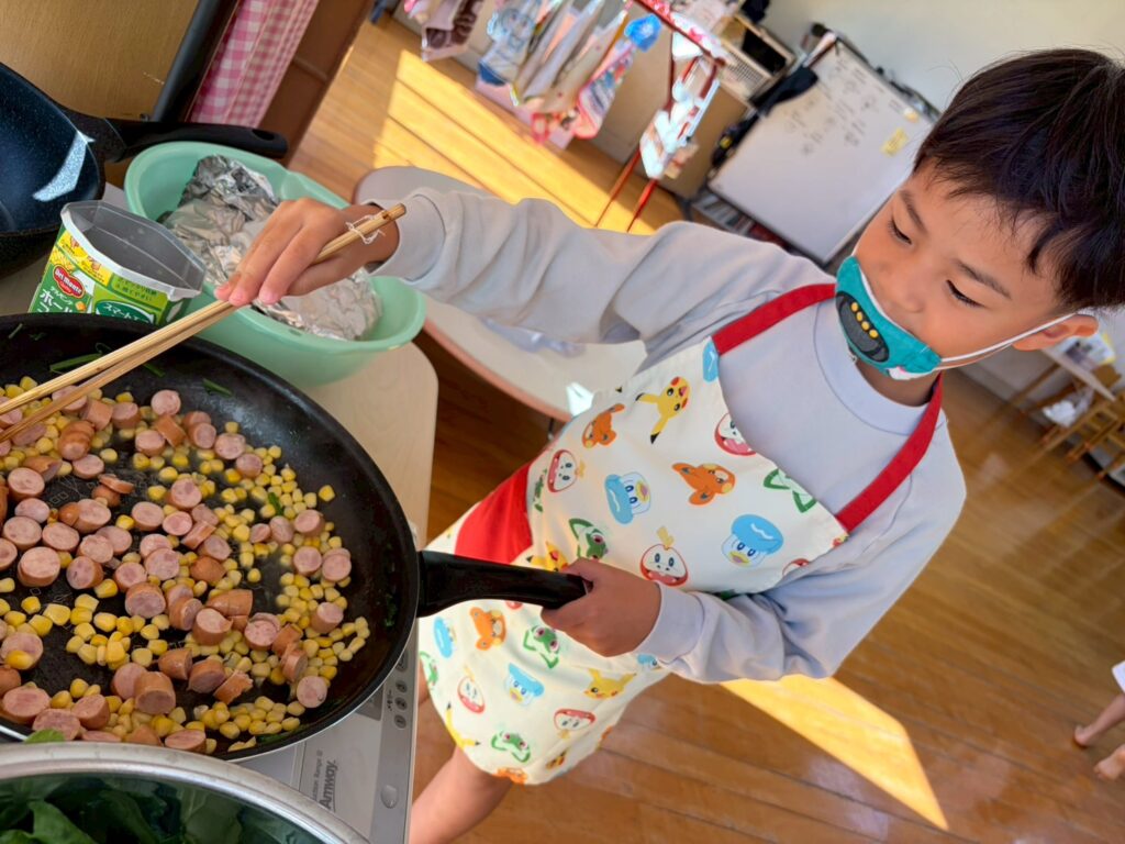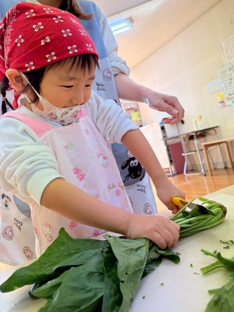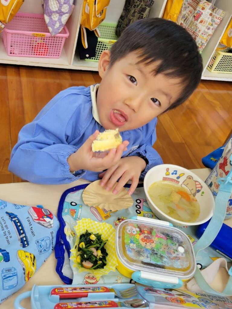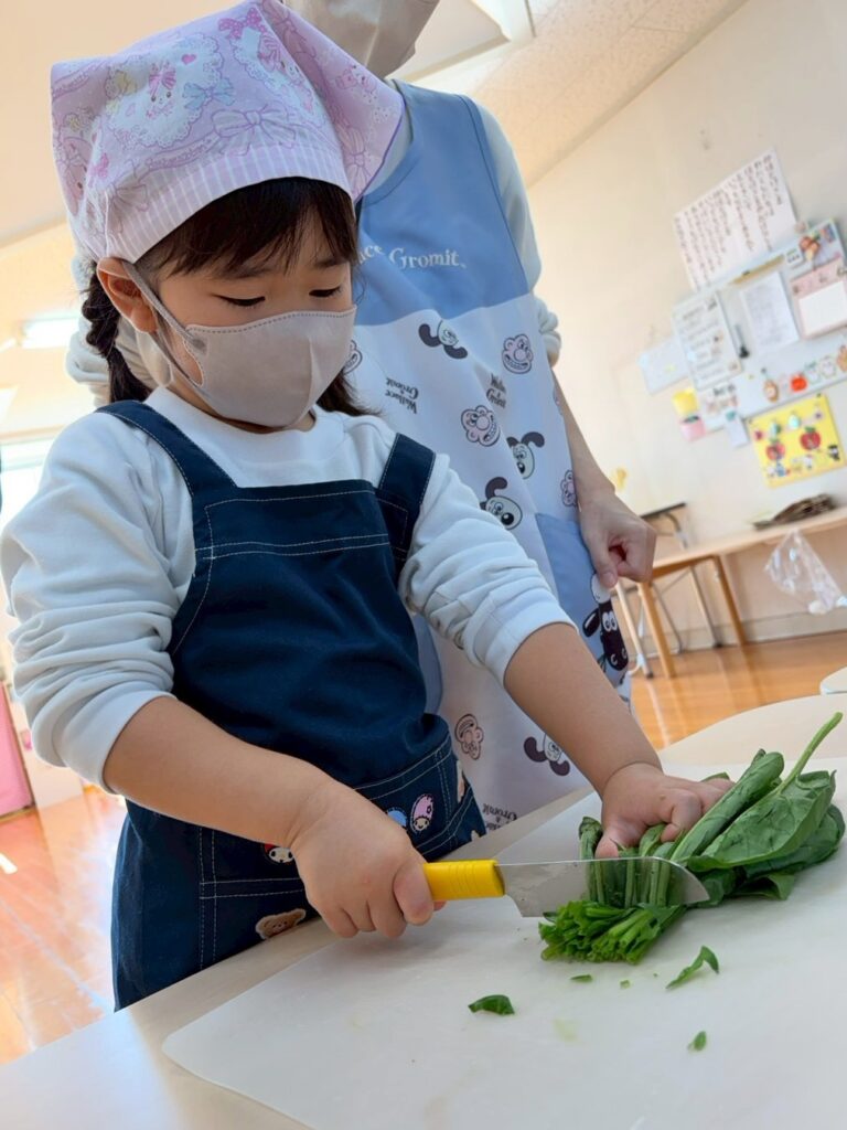 たのしいクッキング ~わたしもできるよ~ 2025年11月20日 最終更新日時 : 2025年11月20日 職員 クッキングの様子です。 年長組 あげって、切るのがむずかしい。こわさないように。 うさぎさんの手で 上手に人参を切っています。 大根をうす~く切っています。私はこんなに上手にきれるかな(ママより) さつまいも、かた~いけど、がんばろう。 こんにゃくってふにゃふにゃ がんばってちぎろう。 お鍋にいれて、お味噌と豚肉をいれて、はい、豚汁ができました♪ 年中組 「うぁ~はやくしたいな」おともだちのエプロンのひもをむすんであげているところ 「ほうれん草ってふわぁふわぁして むずかしい~」 わたしはがんばって、しっかりにぎってきるよ。 よ~く混ぜて うぁ~ へったよ ソーセージとパターで炒めているところ。「いいにおい」 いいにおい。コーンが入ってますます♪ コーンとソーセージとほうれん草、まぜるのたいへん たんぽぽさんの作った蒸しパン、どんな味かな~ みんなでつくったほうれん草のソテー、おいしいよ。大きなお口でパクリ とってもおいしいよ~ グ~♪ 年少組 たまごをわって 牛乳をはかって 小麦粉を入れて こねこねして カップにいれて むしきでむして「はい、出来上がり」 いただきま~す♪おいしい~!!