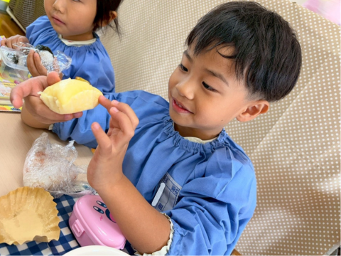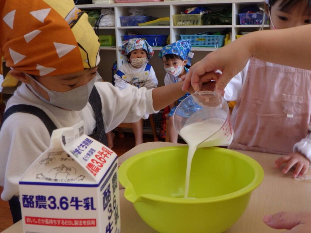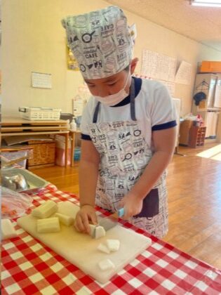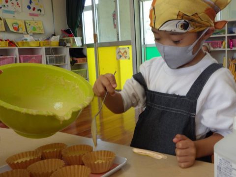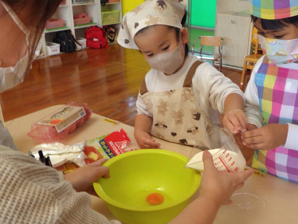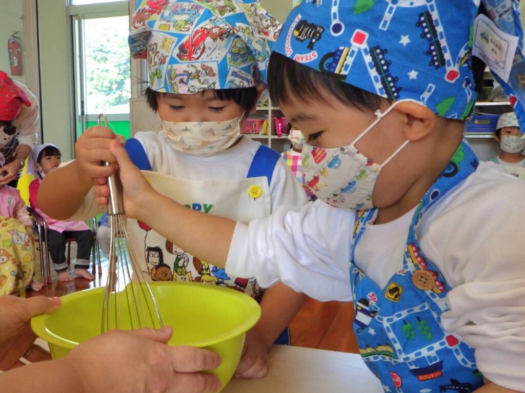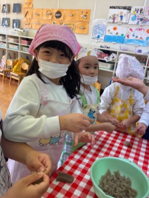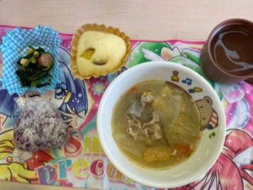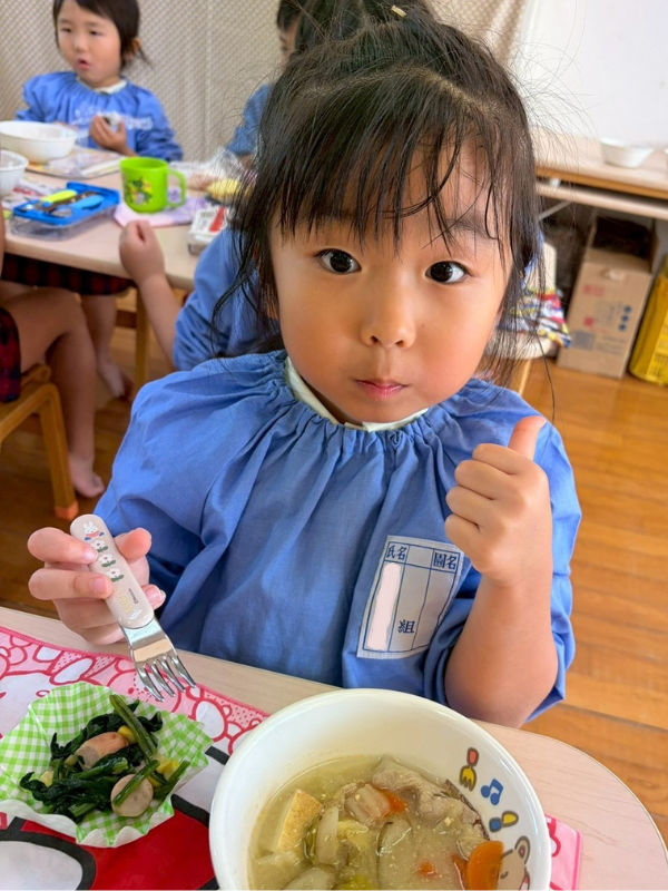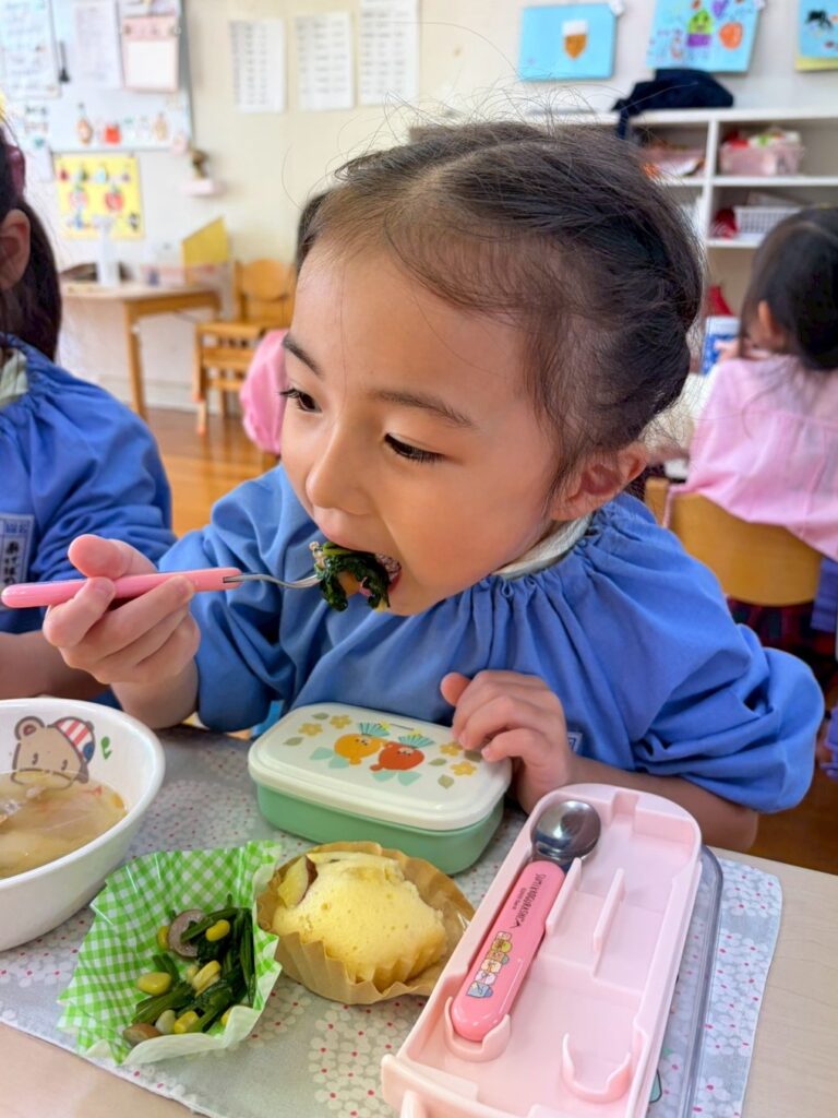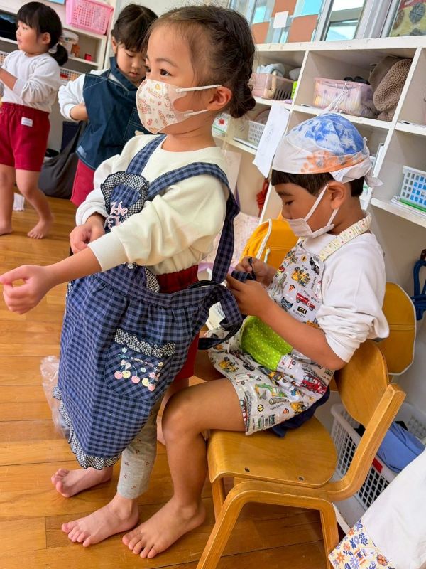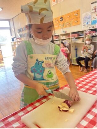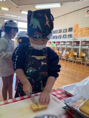 たのしいクッキング ~わたしもできるよ~ 2025年11月20日 最終更新日時 : 2025年11月20日 職員 クッキングの様子です。 年長組 あげって、切るのがむずかしい。こわさないように。 うさぎさんの手で 上手に人参を切っています。 大根をうす~く切っています。私はこんなに上手にきれるかな(ママより) さつまいも、かた~いけど、がんばろう。 こんにゃくってふにゃふにゃ がんばってちぎろう。 お鍋にいれて、お味噌と豚肉をいれて、はい、豚汁ができました♪ 年中組 「うぁ~はやくしたいな」おともだちのエプロンのひもをむすんであげているところ 「ほうれん草ってふわぁふわぁして むずかしい~」 わたしはがんばって、しっかりにぎってきるよ。 よ~く混ぜて うぁ~ へったよ ソーセージとパターで炒めているところ。「いいにおい」 いいにおい。コーンが入ってますます♪ コーンとソーセージとほうれん草、まぜるのたいへん たんぽぽさんの作った蒸しパン、どんな味かな~ みんなでつくったほうれん草のソテー、おいしいよ。大きなお口でパクリ とってもおいしいよ~ グ~♪ 年少組 たまごをわって 牛乳をはかって 小麦粉を入れて こねこねして カップにいれて むしきでむして「はい、出来上がり」 いただきま~す♪おいしい~!!